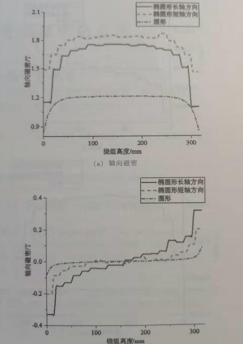 小,然后向兩端逐漸增大,在兩端達(dá)到最大值,且兩端的磁通密度反向。而低壓繞組的磁通密度軸向分量要大于輻向分量。這是因?yàn)榇帕€在繞組中間位